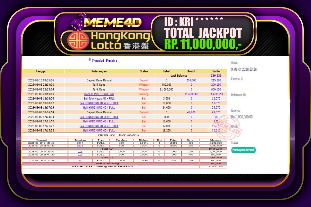 Bukti Jp MEME4D Togel Online 09 March 2026 – MEME4D merupakan situs terpercaya yang selalu membayar berapapun kemenangan semua pemain nya.