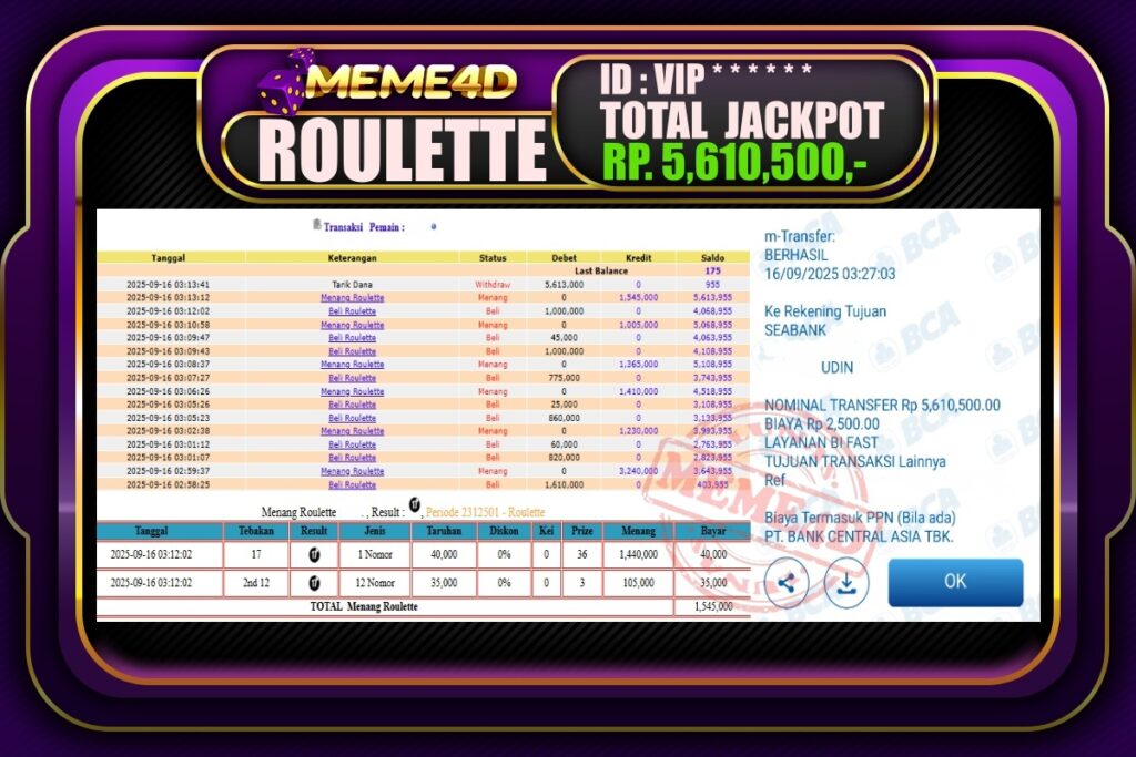 Bukti Jp MEME4D Casino Online 16 September 2025– MEME 4D merupakan situs terpercaya yang selalu membayar berapapun kemenangan semua pemain nya.
