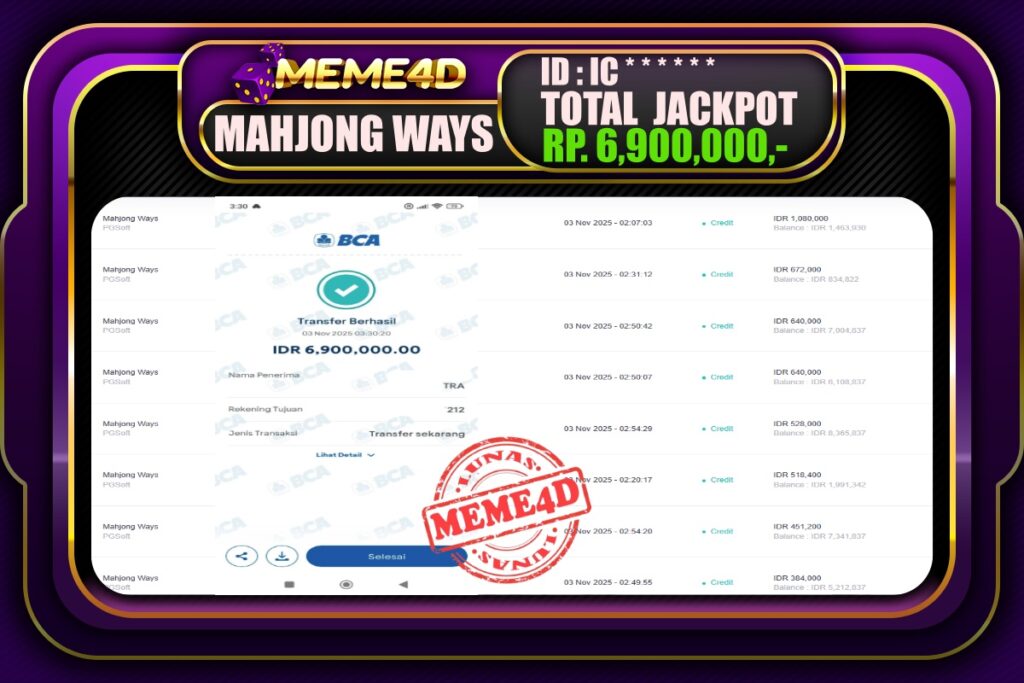 Bukti Jp MEME4D Slot Online 03 November 2025– MEME 4D merupakan situs terpercaya yang selalu membayar berapapun kemenangan semua pemain nya.