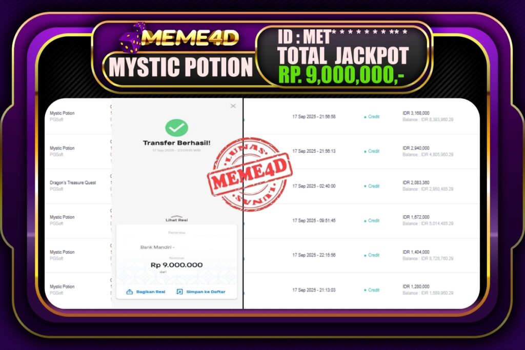 Bukti Jp MEME4D Slot Online 18 September 2025– MEME 4D merupakan situs terpercaya yang selalu membayar berapapun kemenangan semua pemain nya.