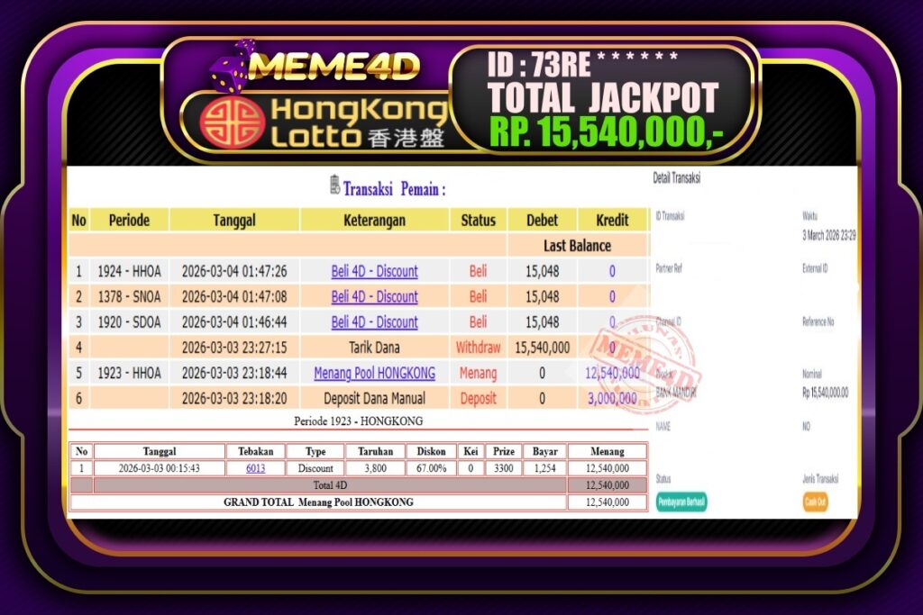 Bukti Jp MEME4D Togel Online 04 March 2026 – MEME4D merupakan situs terpercaya yang selalu membayar berapapun kemenangan semua pemain nya.