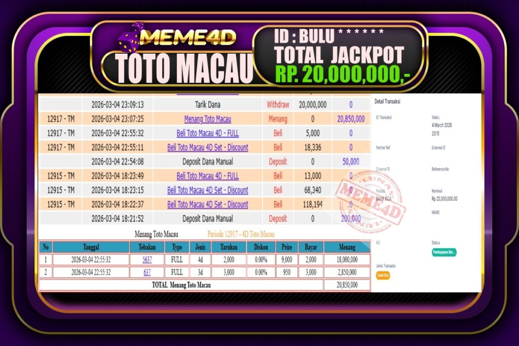 Bukti Jp MEME4D Togel Online 05 March 2026 – MEME4D merupakan situs terpercaya yang selalu membayar berapapun kemenangan semua pemain nya.