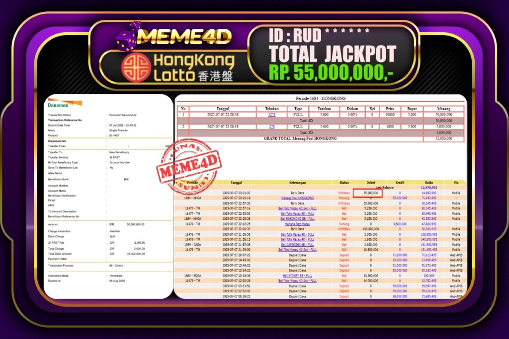 Bukti Jp MEME4D Togel Online 08 Juli 2025– MEME 4D merupakan situs terpercaya yang selalu membayar berapapun kemenangan semua pemain nya.