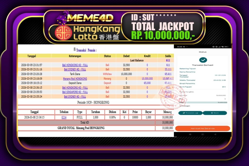 Bukti Jp MEME4D Togel Online 10 March 2026 – MEME4D merupakan situs terpercaya yang selalu membayar berapapun kemenangan semua pemain nya.