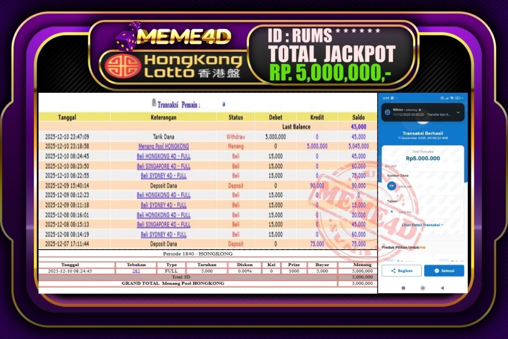 Bukti Jp MEME4D Togel Online 11 Desember 2025– MEME 4D merupakan situs terpercaya yang selalu membayar berapapun kemenangan semua pemain nya.