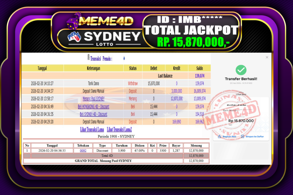Bukti Jp MEME4D Togel Online 20 February 2026 – MEME4D merupakan situs terpercaya yang selalu membayar berapapun kemenangan semua pemain nya.